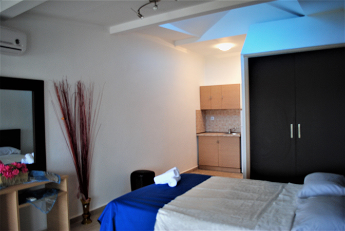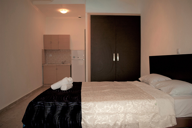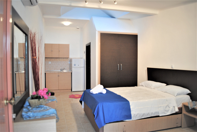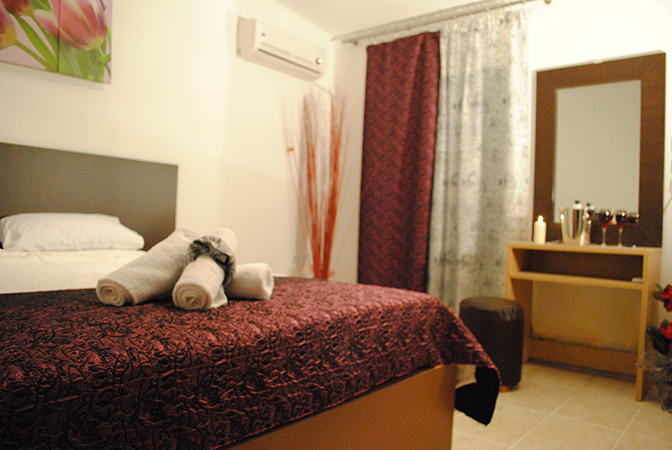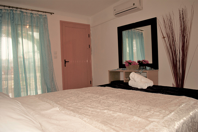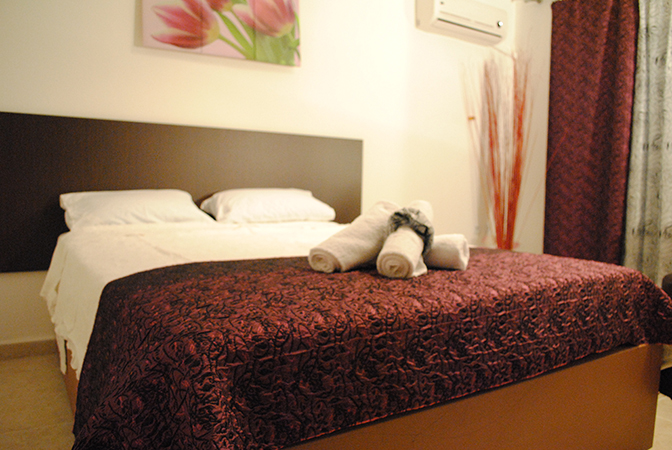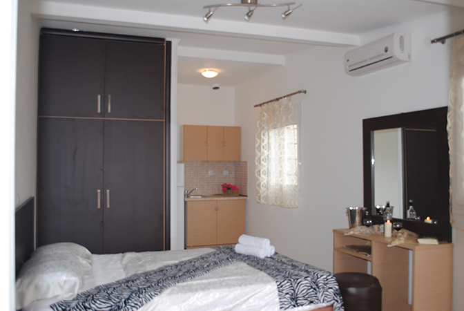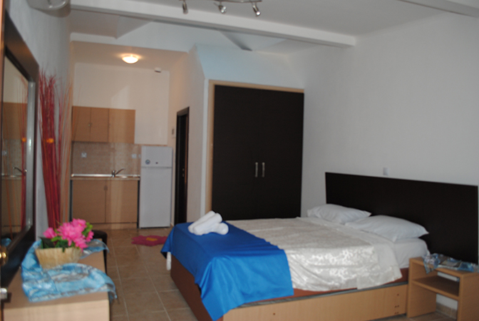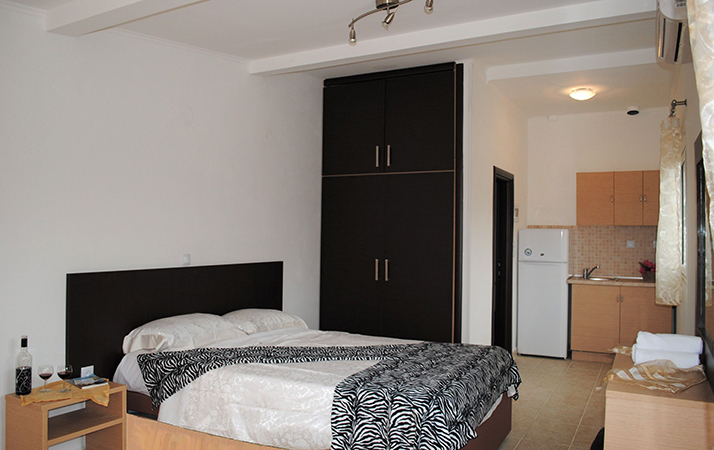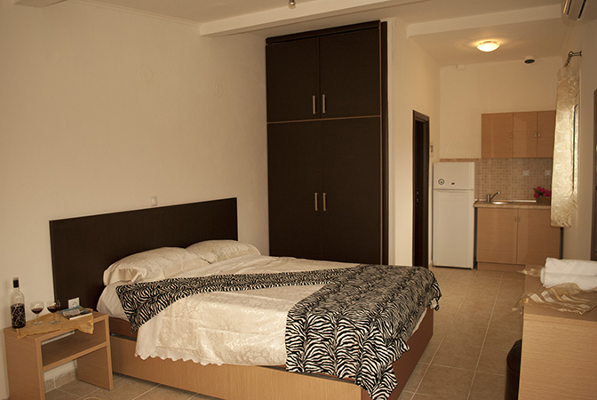 The Bungolow double rooms are on the ground floor. They have a view of the garden. This room type has a double bed and a large wardrobe. Moreover, the room has a private bathroom with a shower. The balcony is spacious with direct access to the yard. For the customer's convenience, there is a fridge and a kettle in the room. The furniture is new and simple. The maximum room capacity is 2 people and we recommend it to couples or couples with one small child.